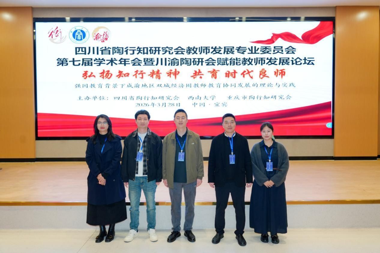 2026年3月27日至29日,四川省陶行知研究会教师发展专业委员会第七届(2026年)学术年会暨川渝陶行知研究会教师发展论坛在西南大学宜宾研究院举行。本次年会由四川省陶行知研究会、西南大学以及重庆市陶行知研究会联合主办,四川省陶行知研究会教师发展专业委员会、重庆市陶行知研究会秘书处、西南大学宜宾研究院等单位共同承办,主题为“弘扬行知精神,共育时代良师——教育强国背景下成渝地区双城经济圈教师教育协同发展的理论与实践”。原教育科学学院院长、生态化教育研究中心主任胡志金教授,教育科学学院副院长谢红雨博士,生态化教育研究中心副主任王建博士,以及教育科学学院丛嫣霖博士、彭玉发老师和研究生郭凤前往参会。