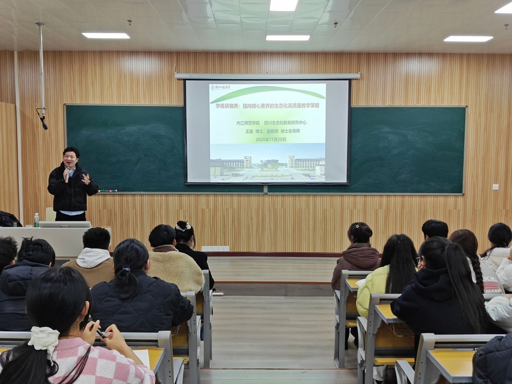 为助力师范生筑牢从教根基,锤炼教书育人本领,11月20日初等教育与科技学院特邀内江师范学院教育科学学院、生态化教育研究中心副主任王建副教授做客“博雅讲坛”,在厚德楼6-306教室举办“学练研做养:指向核心素养的生态化高质量教学策略”的专题讲座。本次专题讲座由小学教育专业负责人余霞老师主持,学院小学教育专业2025全体学生及小学语文教育专业2025级各班学生代表参与。